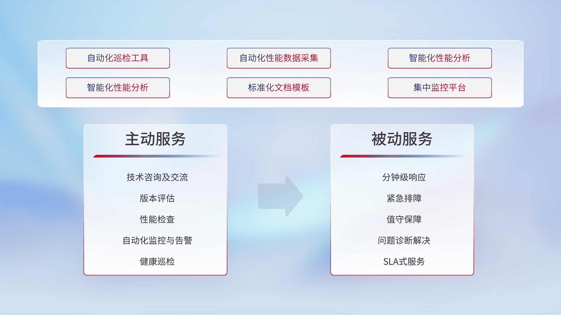 智能化工具和标准化文档,,,,保障服务质量,,,,提供主动服务(包含技术咨询、、、版本评估、、、、性能检查、、自动化监控与告警、、健康巡检)和被动服务包含(分钟级响应、、紧急排障、、、、值守保障、、、问题诊断解决、、、、SLA服务)。。。。
