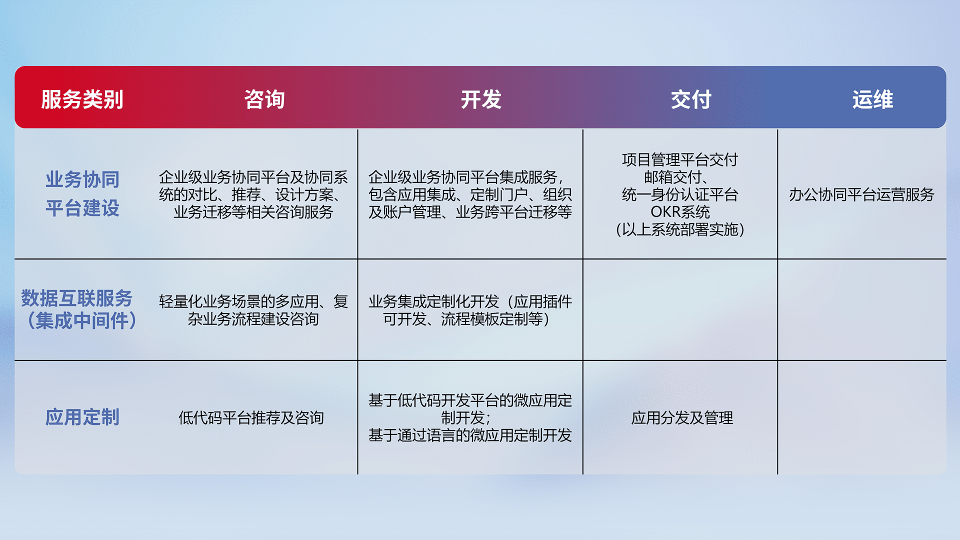 针对钉钉、、企微、、、IDaas等平台级产品提供产品的规划、、、方案、、、交付、、、定制化开发等服务,,实现如统一协同办公、、、、智能客户服务、、、混合会议管理、、、智能数据查询、、、、等业务场景,,实现数字化转型。。。。